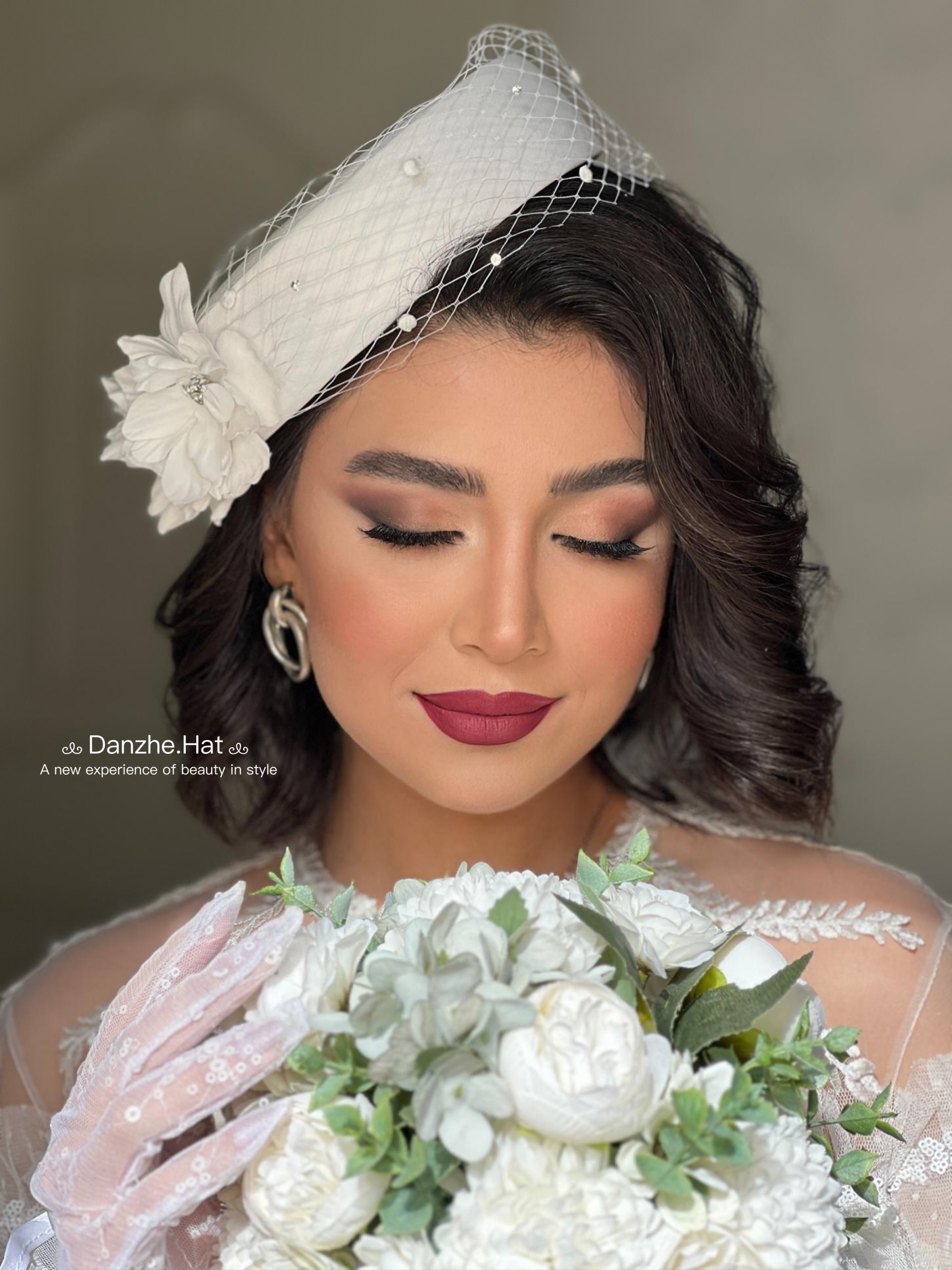 کلاه پیلباکس سفید مدل سوفیادیزاین شده با گلهای دستسازو تور قابل سفارش در رنگ بندی