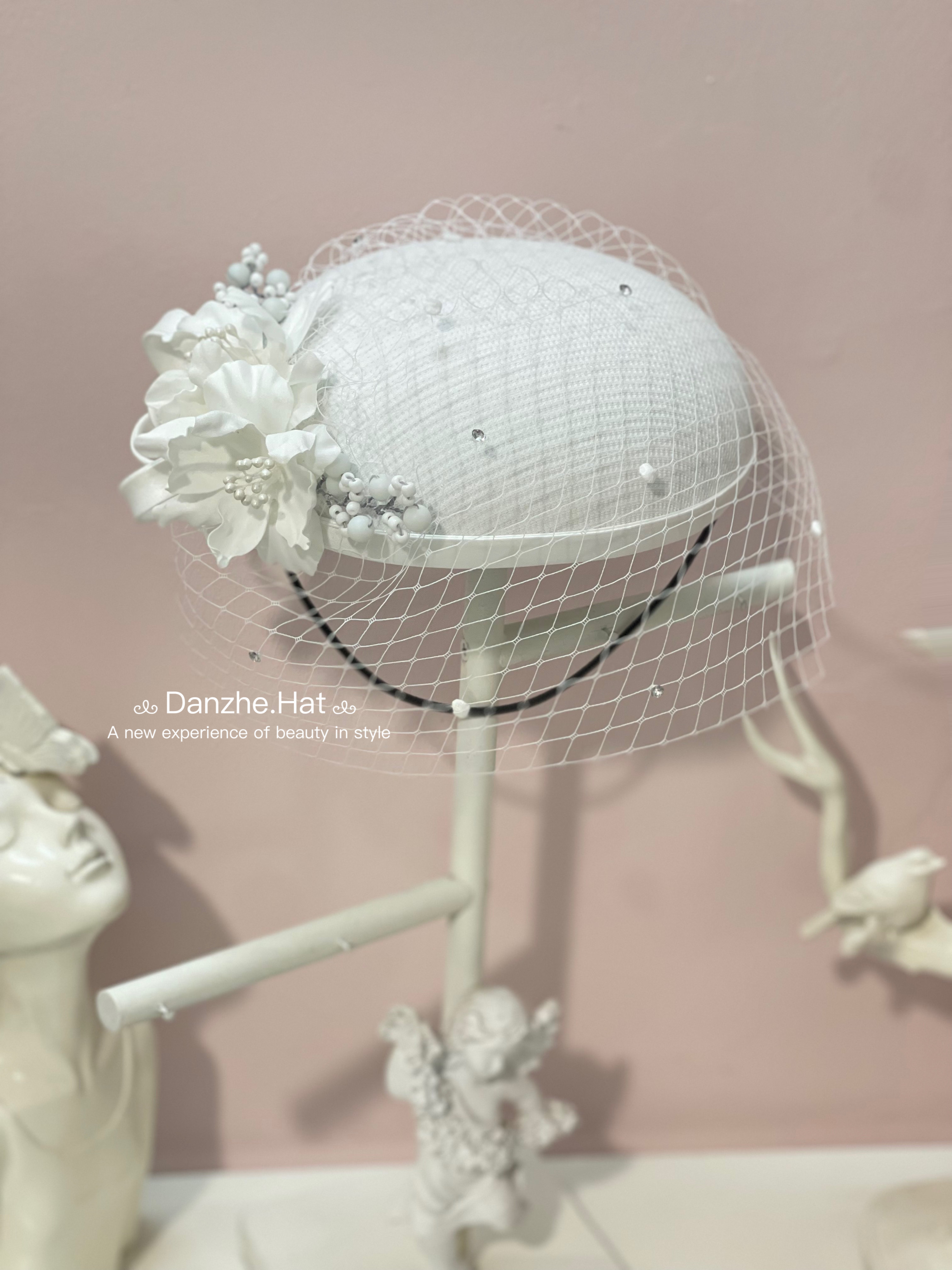 کلاه فرانسوی سفید مدل روناک دیزاین شده با گلهای دستساز و تور و نوار